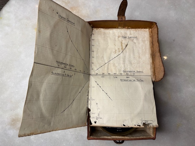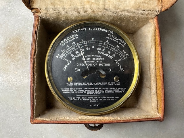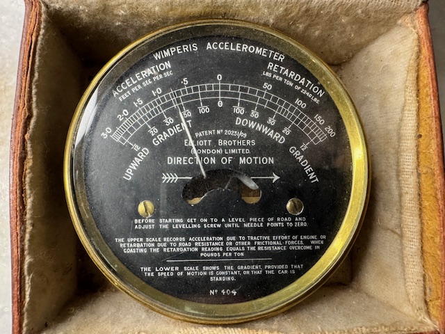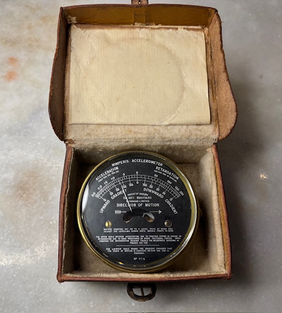 Presented in its original fitted leather box, the accelerometer remains in excellent overall condition for its age, with clean dial lettering, intact glass, and a well-preserved case. The inclusion of its period leather presentation box makes this a particularly desirable collector’s piece, appealing to enthusiasts of early flight, scientific instrumentation, and decorative industrial design.