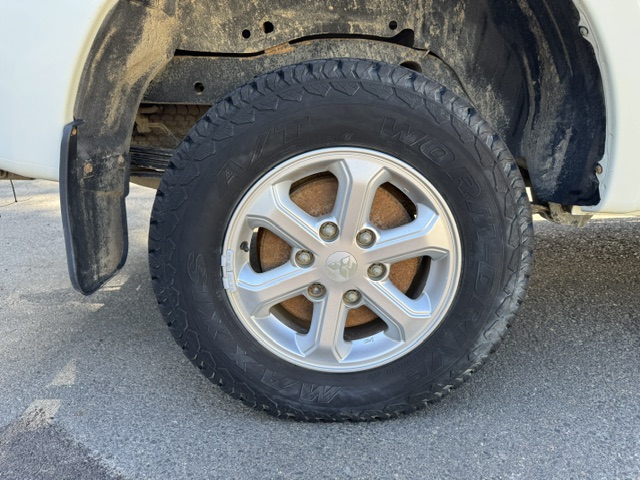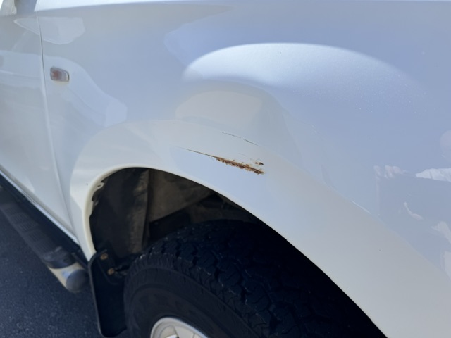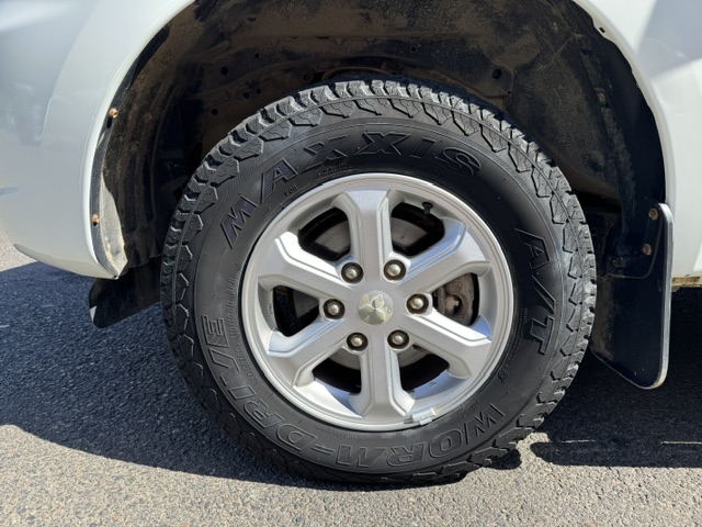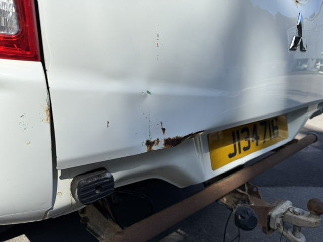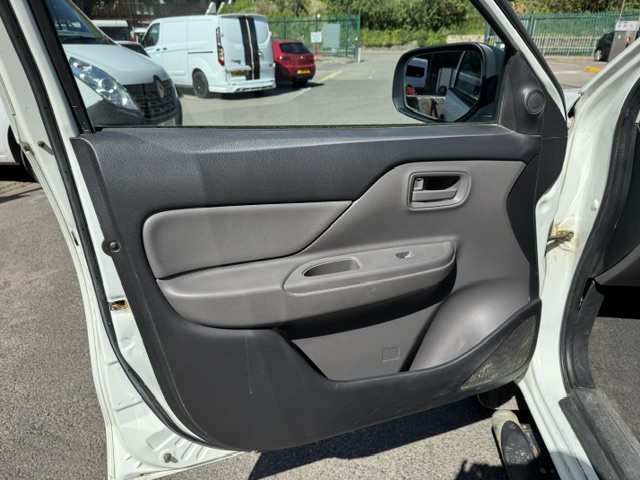 The white exterior is presented in good overall condition for a working vehicle of this type, with only a few expected dents and scuffs. Notable areas include the front driver’s side wing and the lower section of the passenger side tailgate. The rear load bay is open and fitted with a protective liner, showing only light signs of use. The silver alloy wheels are well presented, and all four tyres retain a healthy amount of tread.