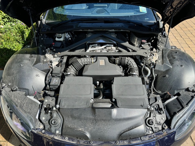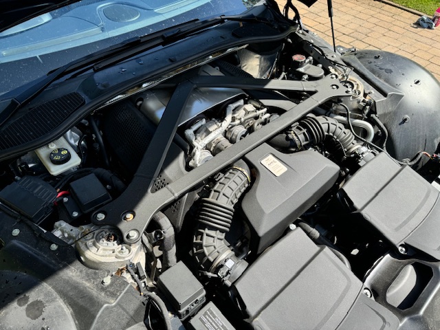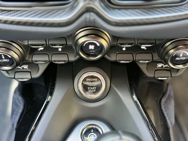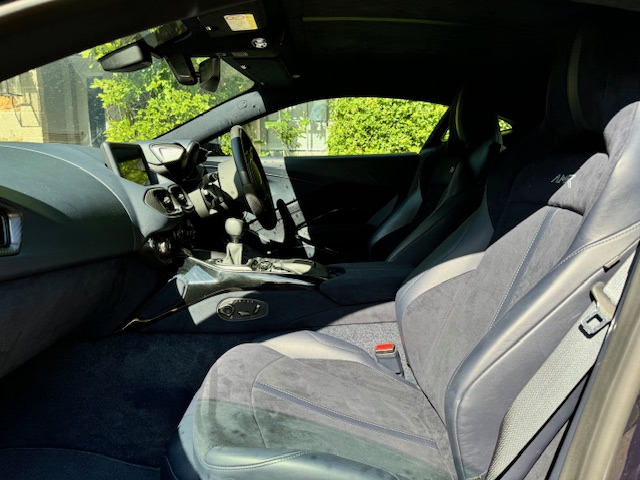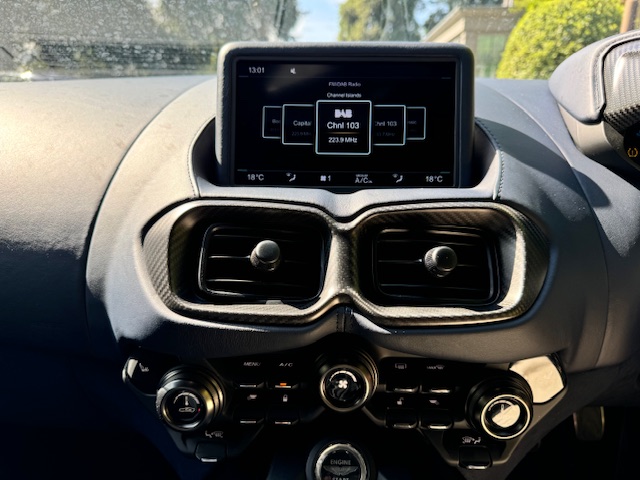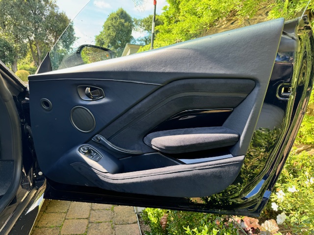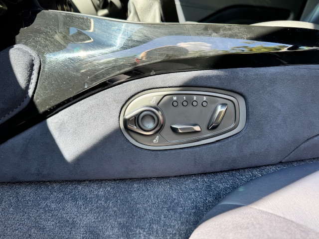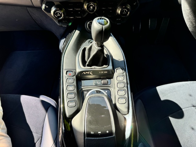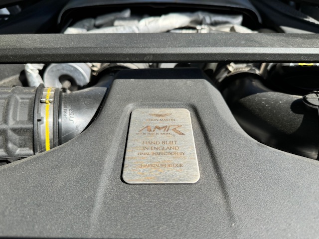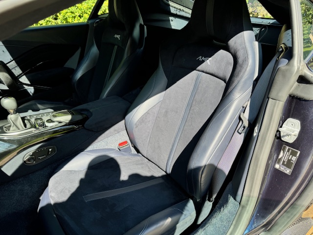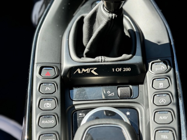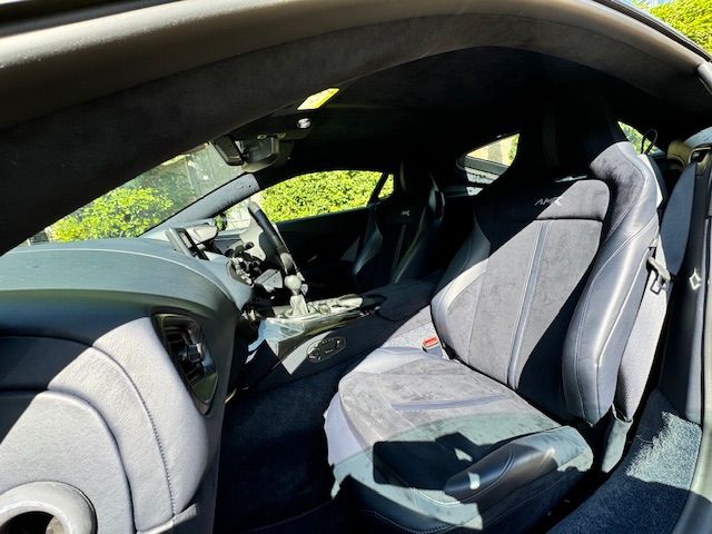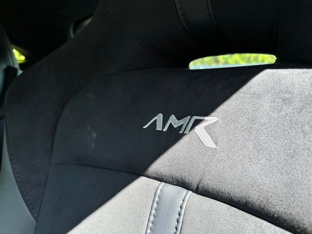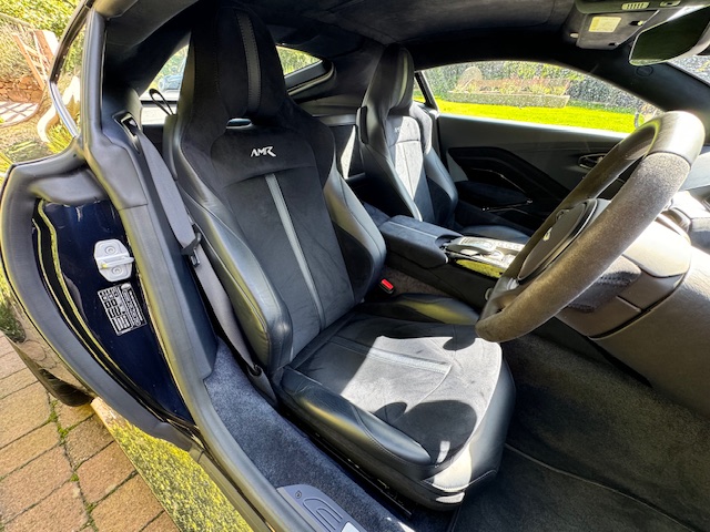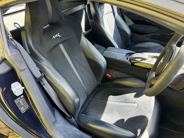 The interior is equally impressive, trimmed in a combination of blue leather and Alcantara, complemented by carbon-fibre inlays. The electrically adjustable, heated, and ventilated seats remain in excellent condition with minimal wear and feature ‘AMR’ embroidery. Equipment includes front and rear parking sensors with cameras, cruise control, climate control, and an infotainment system with satellite navigation.