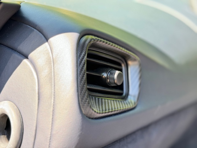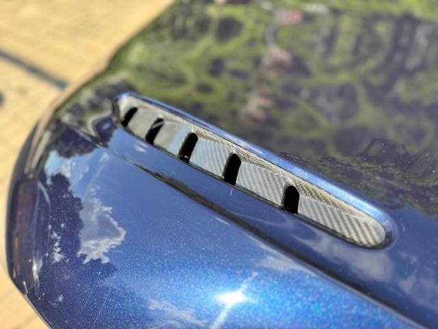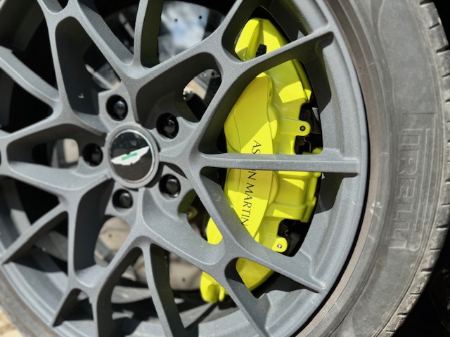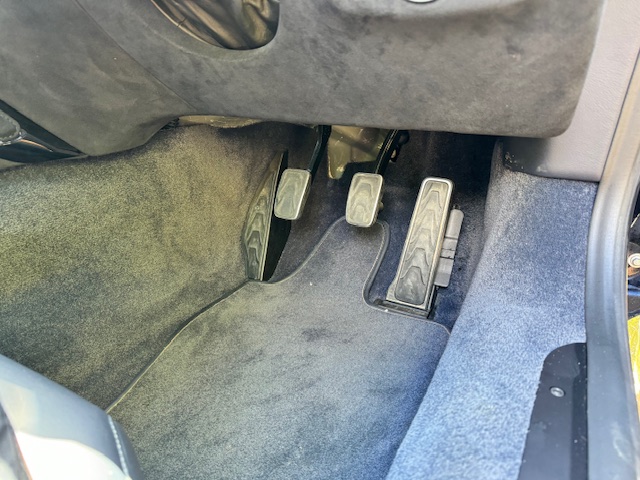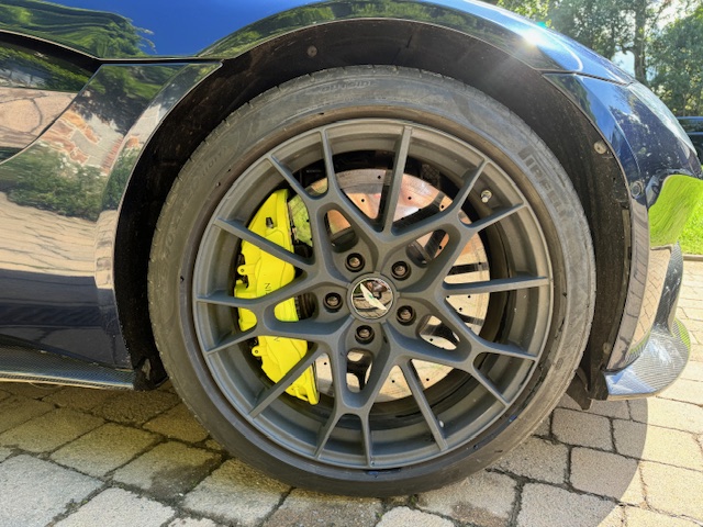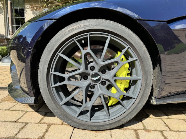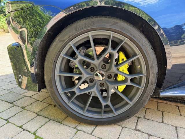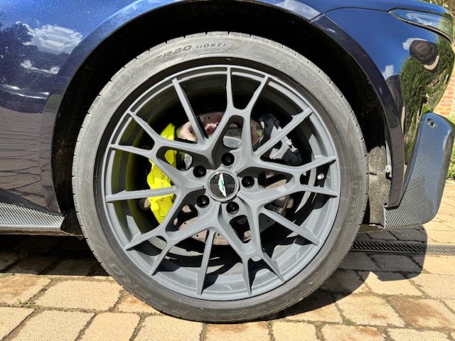 Presented in striking Sabiro Blue metallic, the exterior paintwork is in excellent condition and exhibits impressive depth and gloss in direct sunlight. The car’s racing pedigree is emphasised by extensive carbon-fibre detailing, including side strakes, cooling vents, and additional elements across the front, rear, and bonnet, all contributing to both aesthetics and weight reduction. The matte-grey 20-inch alloy wheels complete the look, with only a minor scuff noted on one rear wheel. Behind them sit bright yellow brake calipers paired with high-performance ceramic brake discs.