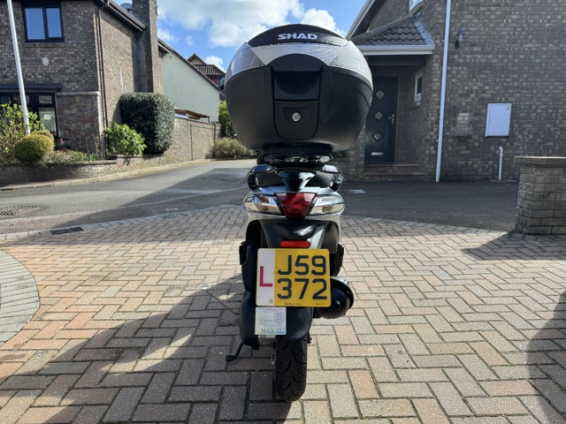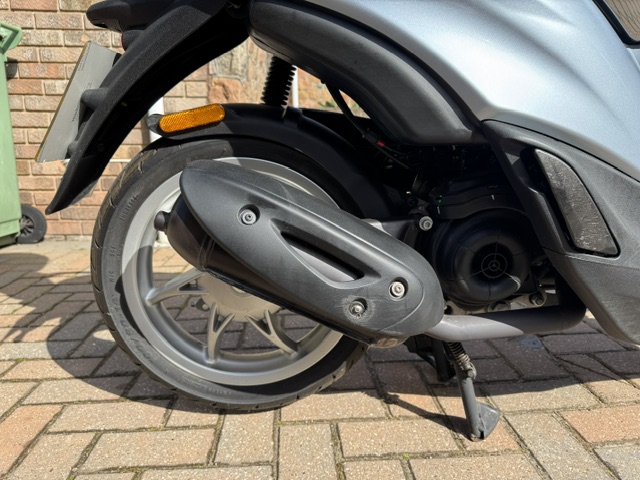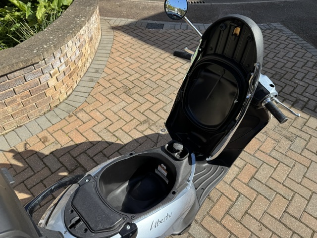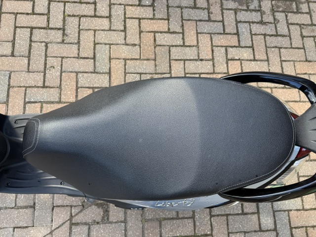 The black seat remains in as-new condition, and additional practicality is provided by the fitted rear storage box, along with under-seat storage. The scooter rides on standard wheels with tyres that retain excellent tread.