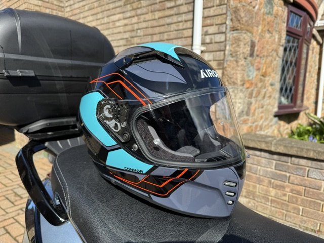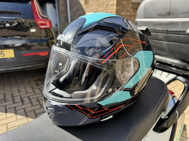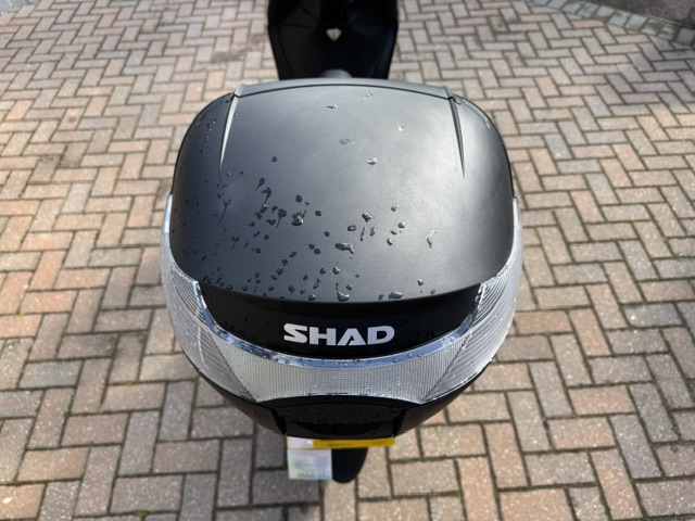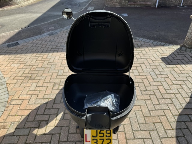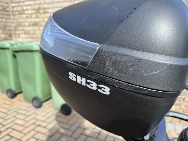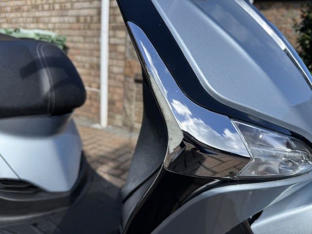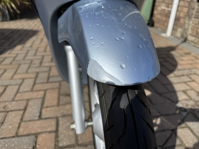 The grey exterior panels are presented in excellent overall condition, as expected given the minimal use. There are a few minor cosmetic marks, including a small scuff to the front mudguard, side panel and rear-mounted helmet box. The right-hand side mirror is currently missing. Aside from these minor points, the scooter presents very well.