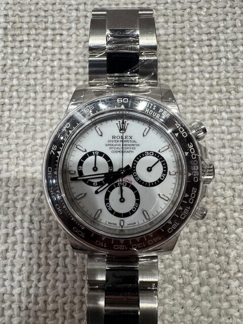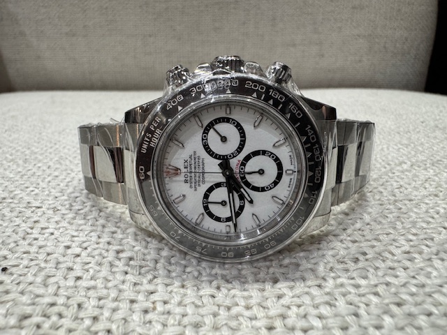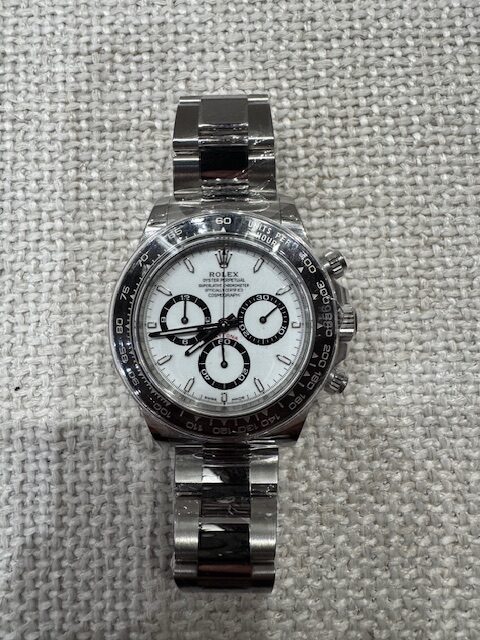 The Rolex Cosmograph Daytona ref. 126500LN is the latest evolution of the brand’s most iconic chronograph, introduced in 2023 as the successor to the 116500LN. This 2025 example, offered in brand new and unworn condition, features the highly sought-after white “Panda” dial with black-ringed subdials, housed within a 40mm Oystersteel case and topped with a black Cerachrom ceramic bezel.