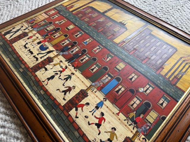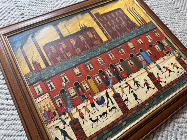 An original acrylic painting by British artist D. L. Minikin, executed circa 2000. The composition depicts a terrace housing and industrial streetscape rendered in a naïve, expressive manner, reflecting the Northern industrial aesthetic associated with L. S. Lowry.